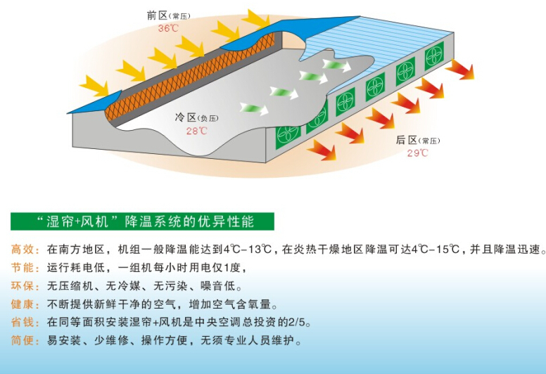 其降溫?fù)Q氣通風(fēng)作用,可有效處理工廠95%到99%的高溫、熱空氣渾濁問題。它可以吹氣排氣質(zhì)量有保證。是降溫通風(fēng)的選擇。降溫水簾是目前工業(yè)行業(yè)流行的,它的降溫環(huán)保作用和省電作用是其他降溫設(shè)備所沒有的。